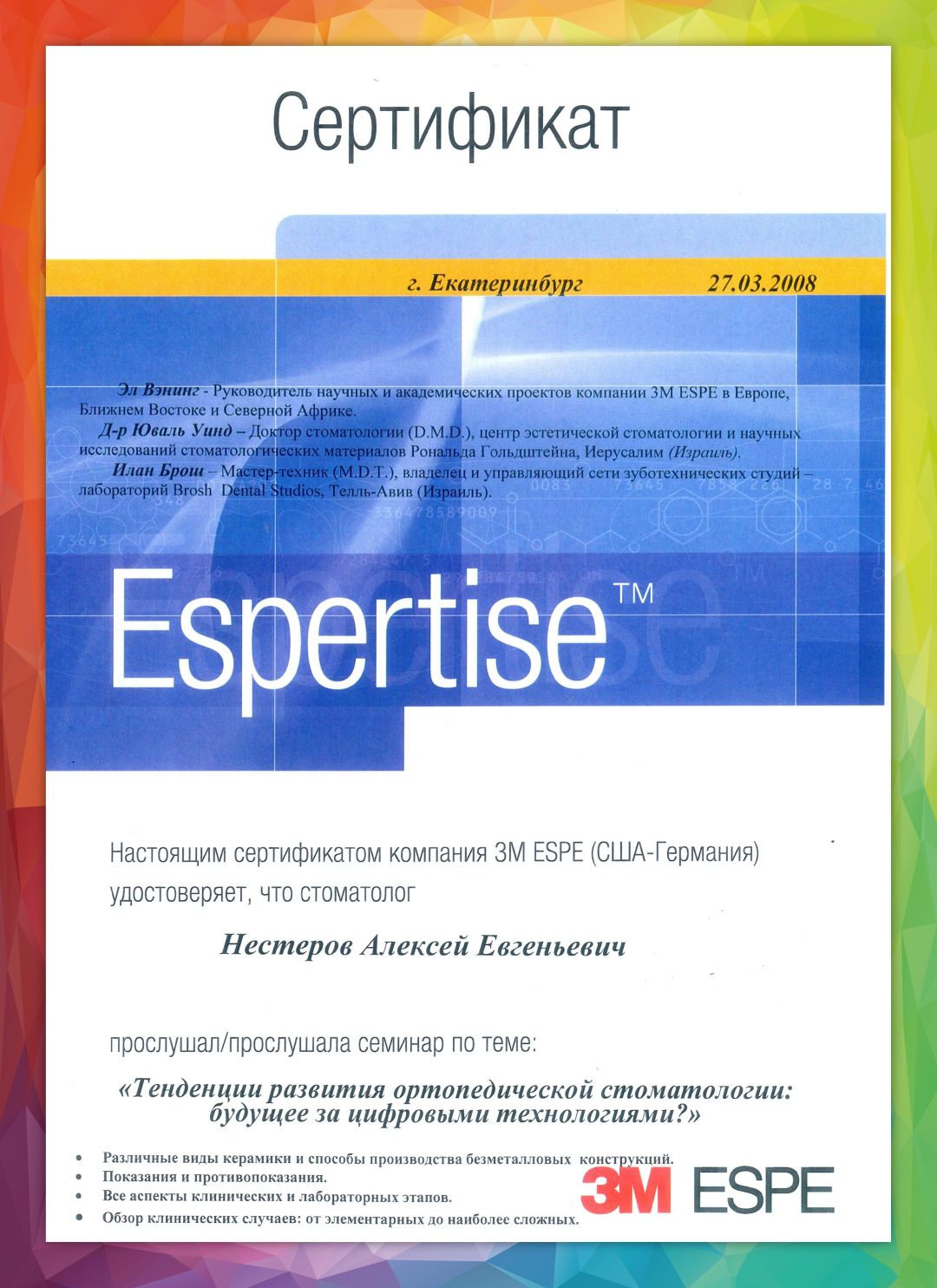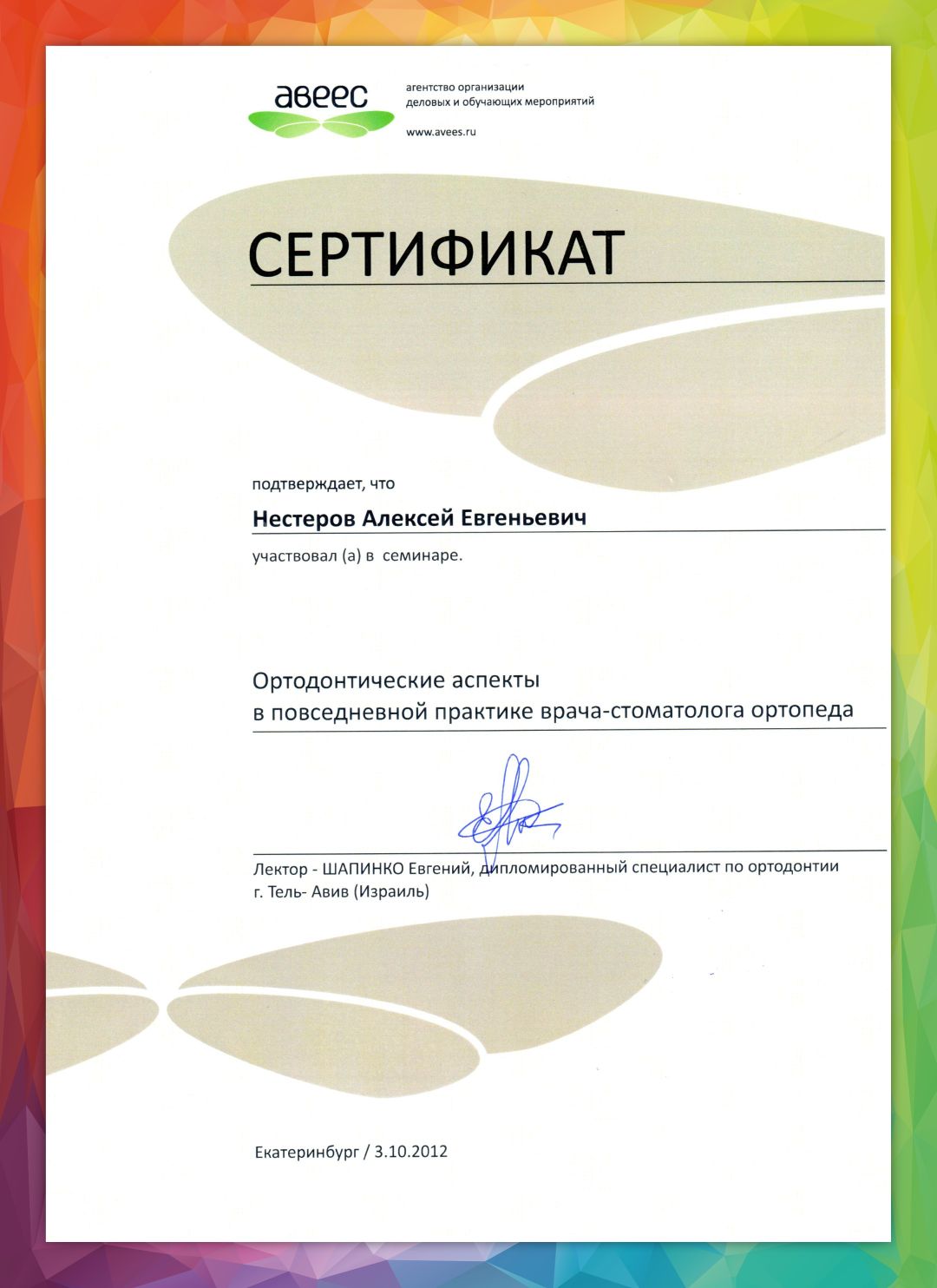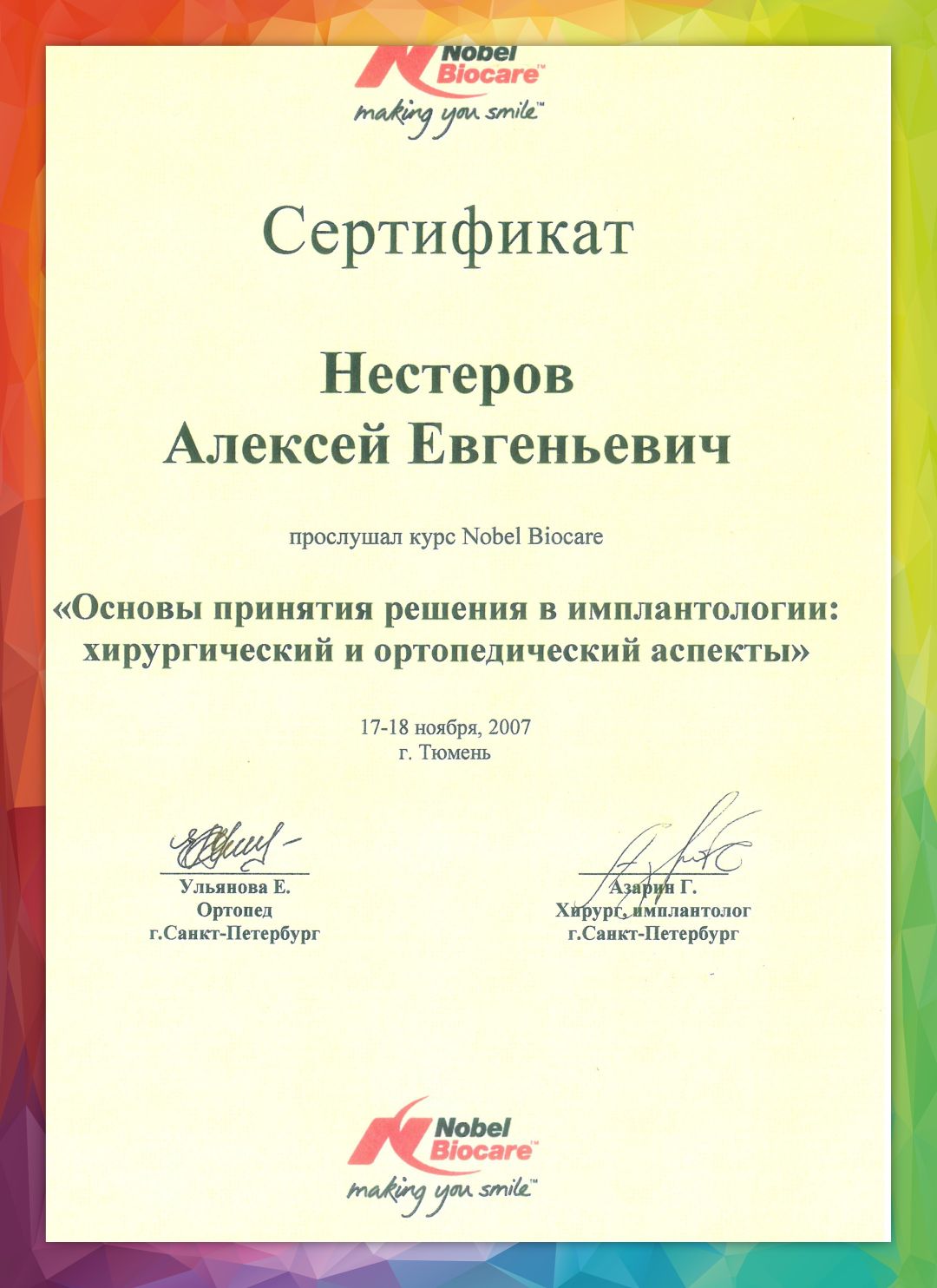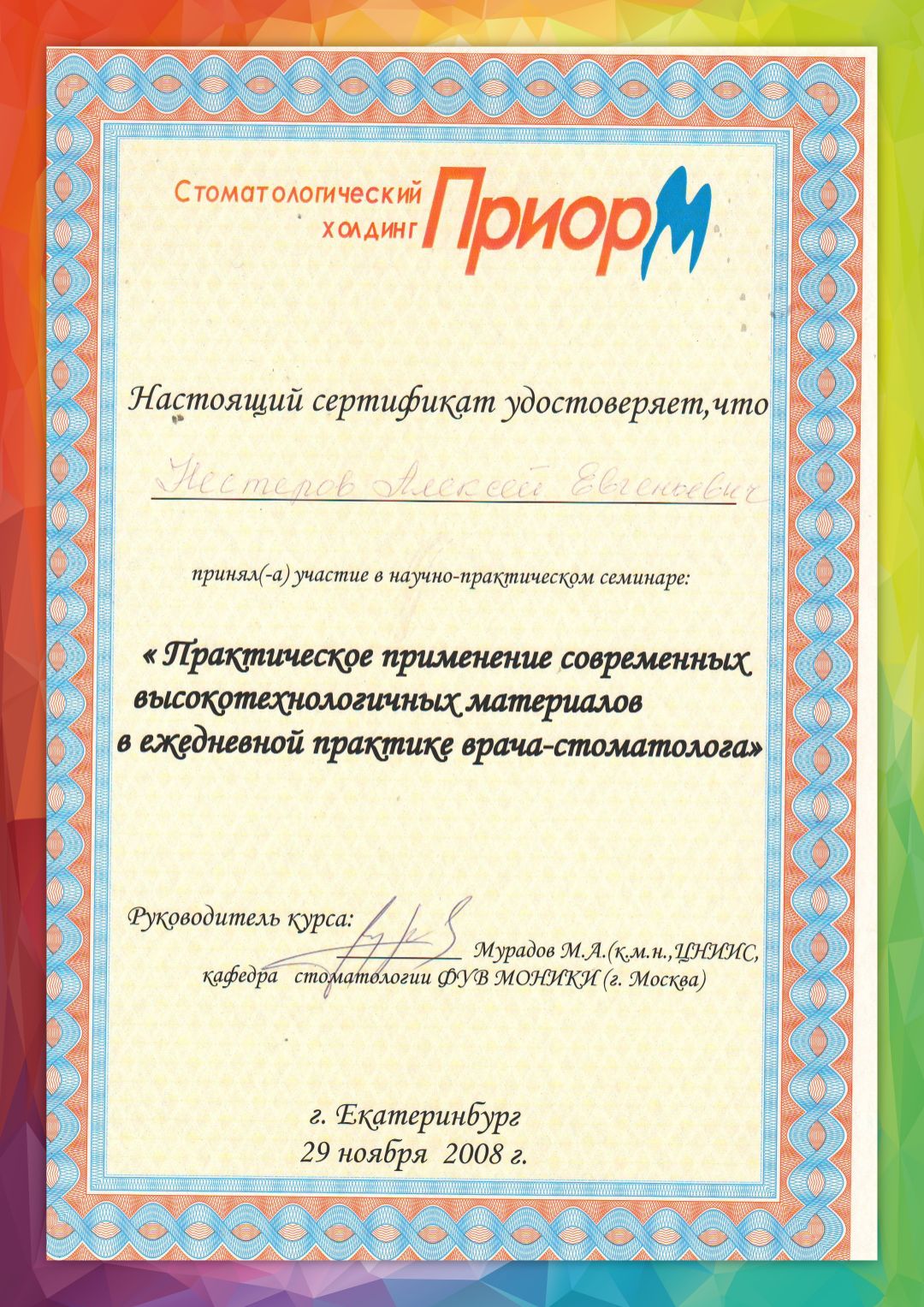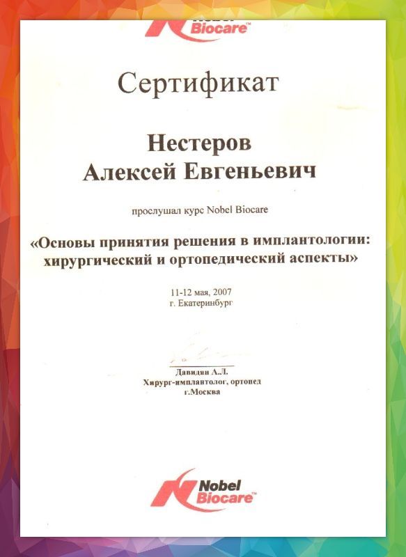 2007г. - прошел профессиональную переподготовку в ГОУ ВПО УГМА Росздрава по ортопедической стоматологии.
