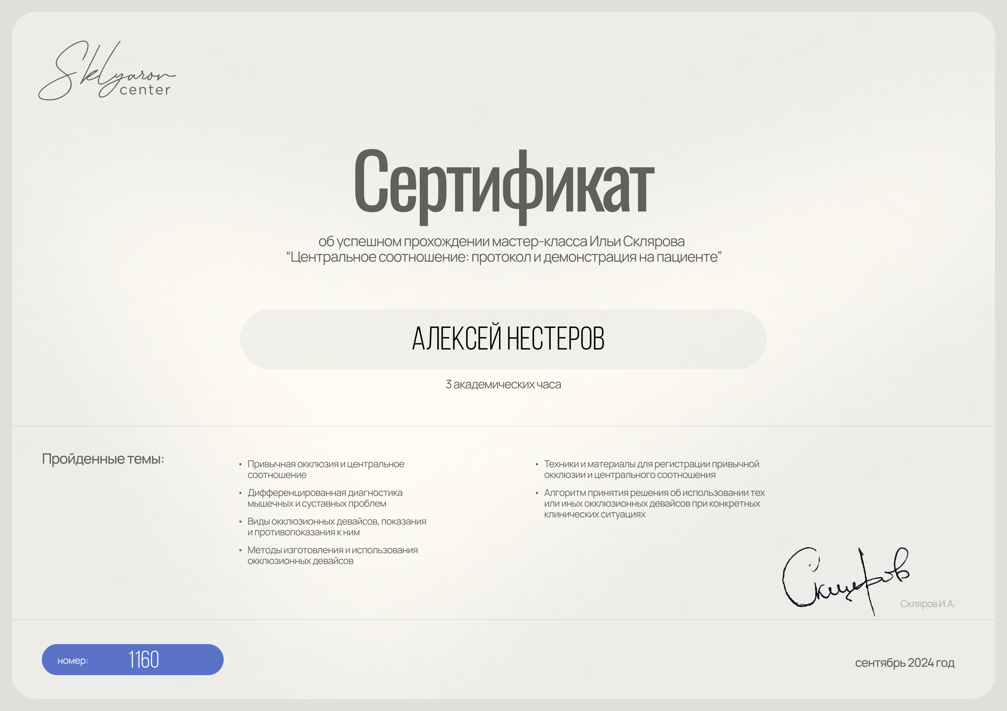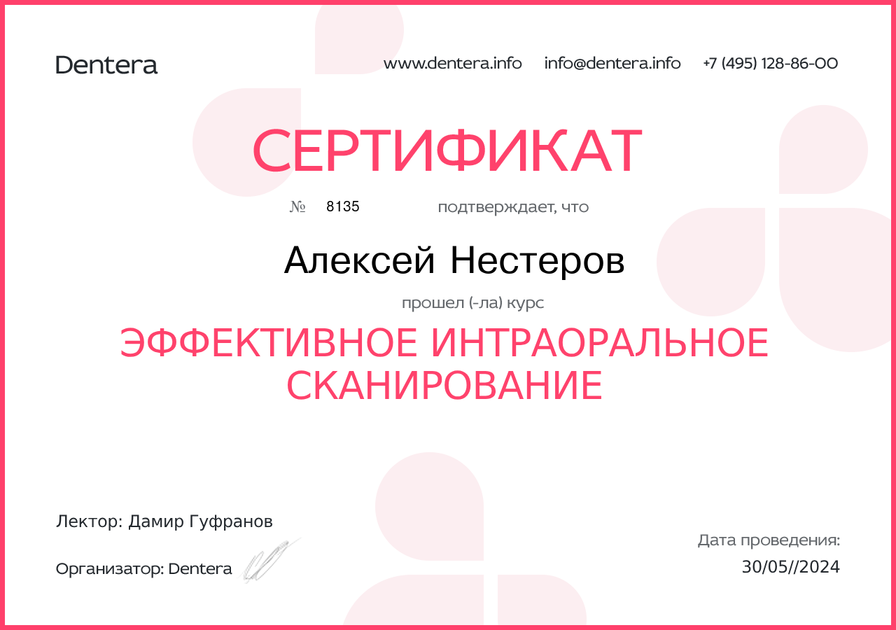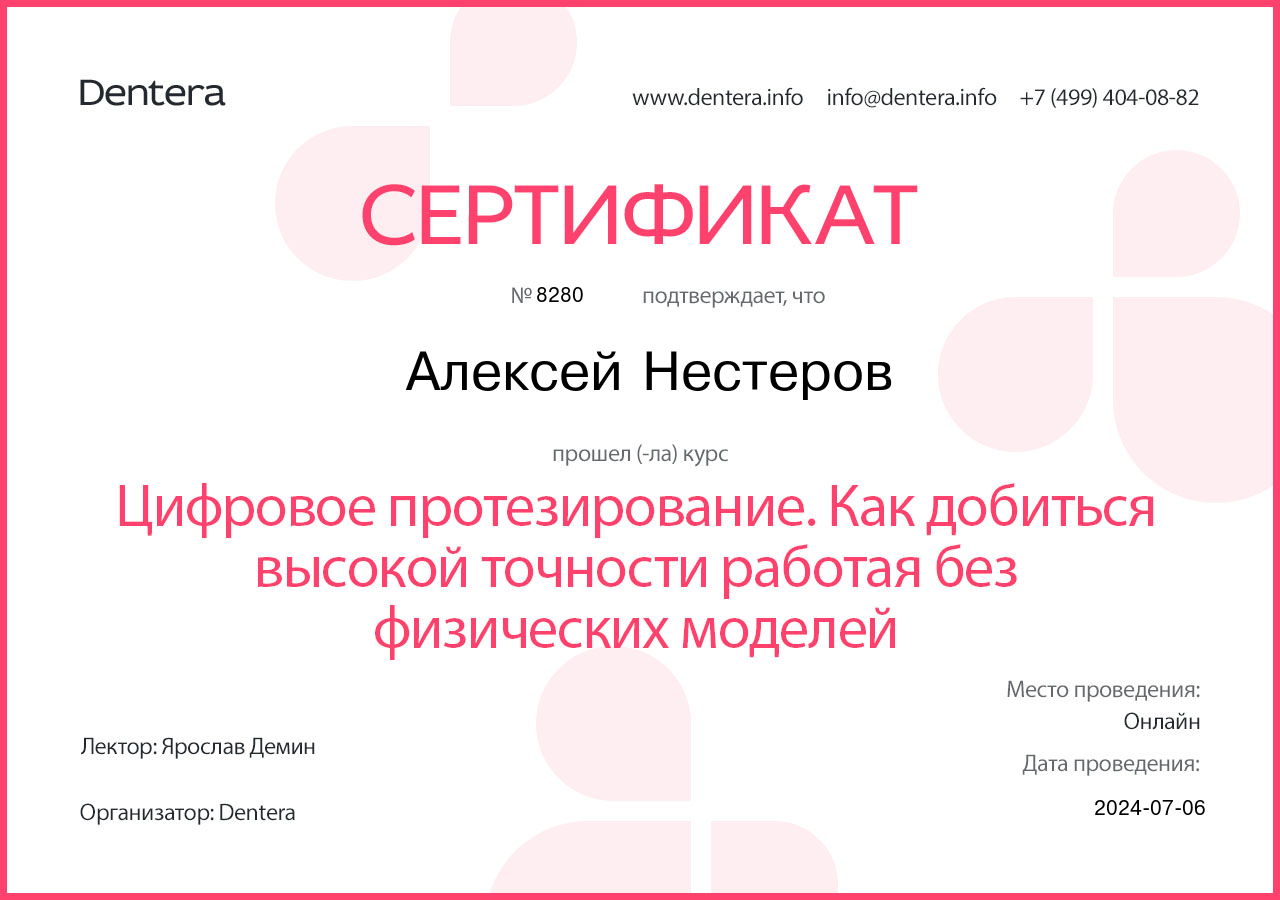 Постоянно совершенствует свои знания и навыки, посещая курсы и мастер-классы как российских, так и зарубежных специалистов.