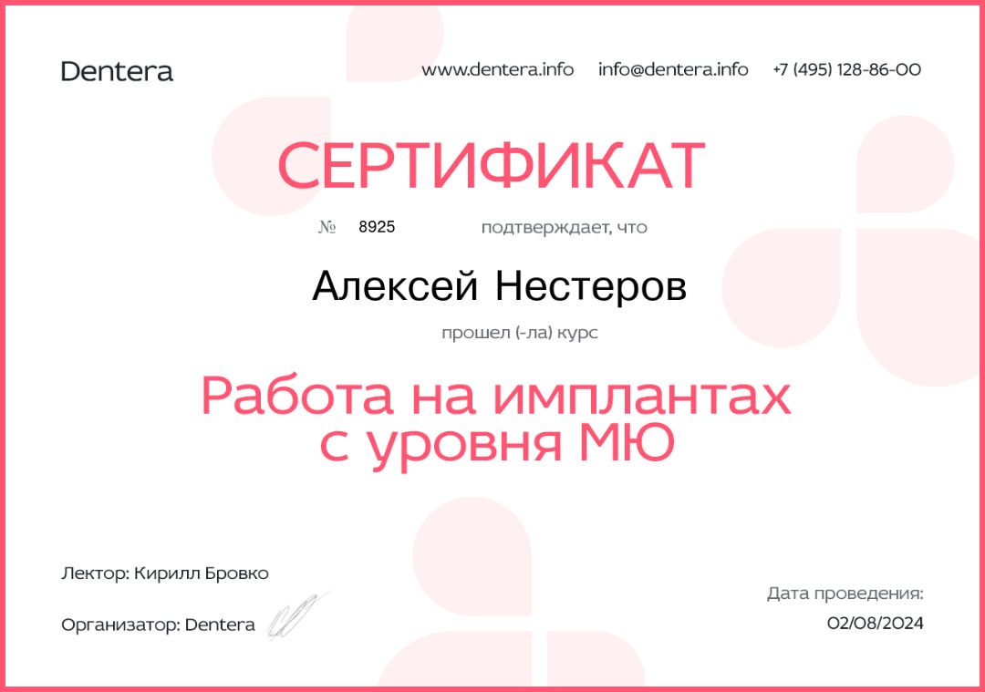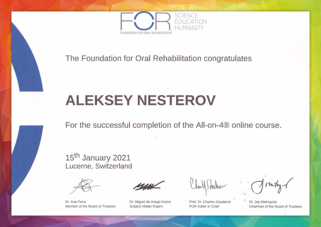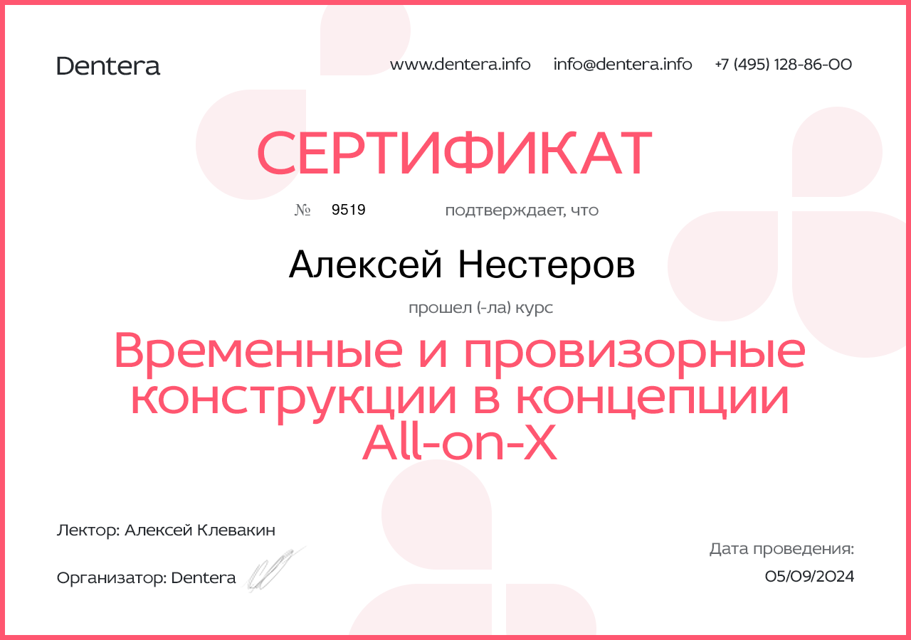 Использует в своей практике одномоментную имплантацию с немедленной нагрузкой как одного зуба, так и всего зубного ряда, концепцию All-on-4, All-on-6.